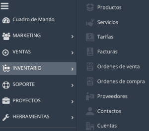 La sección de inventario esta compuesta por los módulos Productos, Servicios, Tarifas, Facturas, Órdenes de venta, Órdenes de compra, Proveedores, Contactos y Cuentas por defecto.