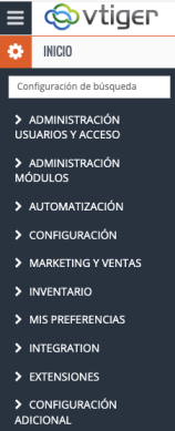 La página de Configuración de Vtiger 7 está organizada en varias secciones. A continuación, se describen las más importantes con mayor detalle: