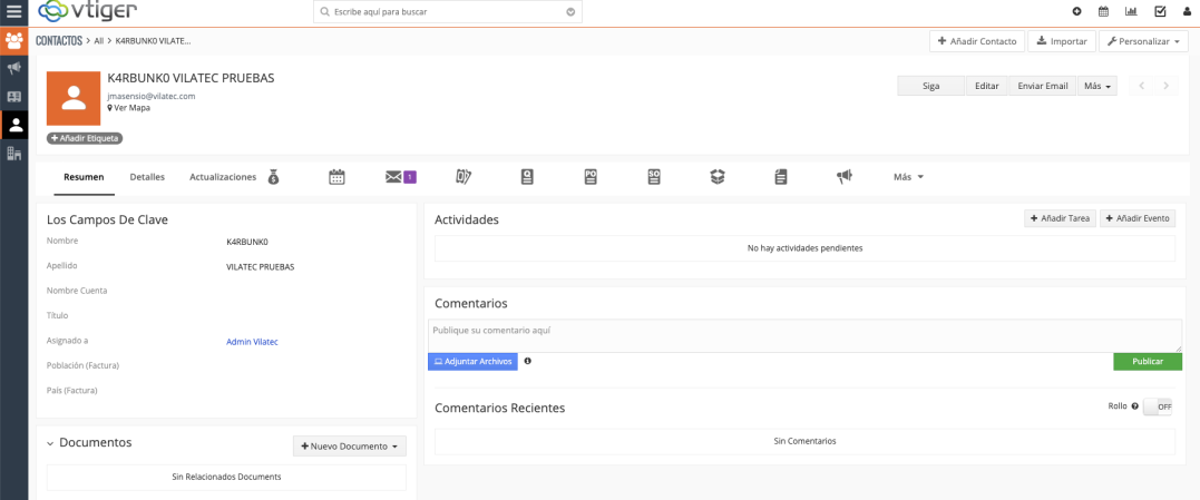 En esta pantalla podemos ver los campos clave (que se pueden definir para verse en esta pantalla), las actividades de tipo evento o tarea que tiene el contacto, los comentarios y archivos que el usuario del CRM ha vinculado al contacto, algunas acciones rápidas como enviar email, seguir, editar etc.