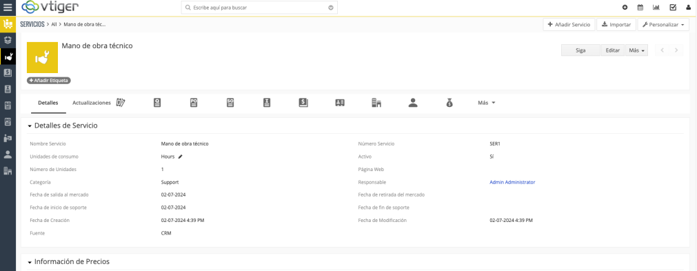 izquierda|sinmarco|1274x1274px El Servicio por defecto no tiene resumen, muestra directamente el detalle del servicio. Como casi todos los demás módulos, presenta una serie de relaciones entre otros módulos, como son Incidencias, cotizaciones, órdenes de compra, órdenes de venta, facturas, tarifas, pre-contactos, cuentas, contactos, oportunidades y documentos.